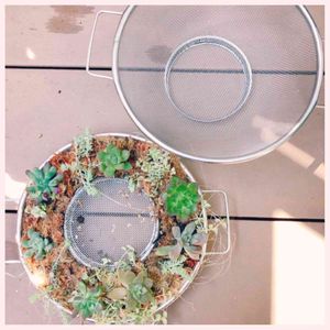 使ってないザルをアレンジした多肉とセダムのリースを作ってみました。 セダムが広がってくれるといいなぁ。