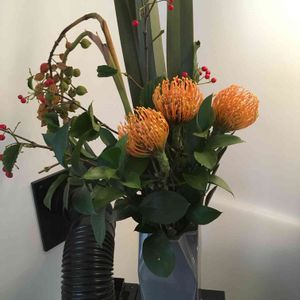 憧れの花屋さんに行ってきました。リクエストは、秋のイメージで、ピンクッションと「赤」を使うこと。モダンな和の香り漂うアレンジとなりました。 左の鈴なりの実は、月桃。 赤い実は、ナンテンかと思いきや、ガマズミというものだそうで。(確かに、葉が違う) 後ろにある長いツンツンした草の名前を聞きそびれてしまいました。もしわかる方いらっしゃいましたら、教えてください。