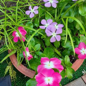 実家(空家)の縁側の靴脱石の陰で見つけたイノモトソウ🌿 ニチニチソウとの和風寄植え…のつもりです😅💦🌿