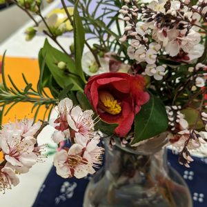 〈 桃の節句 〉🎎 娘達も成長し 段飾りをやめてからは ささやかに お祝いを (雪洞や菱餅 お道具が行方不明に) お花は 空き地で見かけた菜の花 お花屋さんに頂いた 処分品の スイトピー、ガーベラ... 桃の代わりに 出先の梅 etc... 頂き物で 飾ってみました❣️
