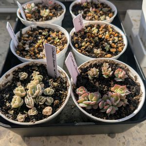 20251020 連投失礼します。春蒔(夏蒔き?)の実生たち。ボチボチ腰水切ってもう少し水はけの良い土に植え替えてあげたいところです。ライトないとこんなもんなのかな💦 ①シムランス アセンション セルフ御一行様。割と個性に乏しい💦親も地味っちゃぁ地味だしなぁ。色味よりフリル勝負? ②カマノイ プエブラ様御一行。こちらは原種の割にはお顔が色々。みーんな地味ですけど🤣 ③BBMxCDZ御一行様。もしかして、BBMのセルフになっちゃってる?🤣 ④チワワエンシス ジェコラ様御一行。なんかみんな葉が縦についてます💦土が良くない? ⑤ストリクチフローラ サルティーヨ御一行様。ここにきてスイッチ入った?案外良くなるかも😝