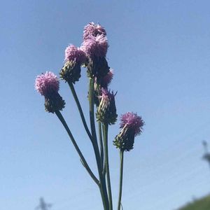 キツネ🦊アザミです。近所の空き地に咲いてました。お花は、これ以上開かないし、葉っぱにはトゲもありません。厳密にはアザミではないので、名前にキツネがつくのだそうです。
