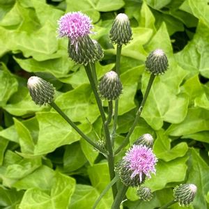 キツネアザミ🌸 アザミによく似ているけどアザミでは ないそうです。 トゲも無く、葉は柔らかい🌿 蕾はアポロチョコみたい💕