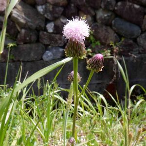 雑草の中にかわいいお花が咲いてます。 名前はわかりませんでしたが、調べたら キツネアザミ かなぁと。 トゲトゲがないアザミです。
