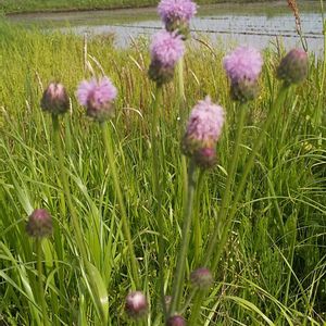キツネアザミが農耕放置地にイ~ッパイ咲いてて😀 ビックリポン! 筒状花の集まりでできてる花の形状を化粧道具の眉はきに見立てて江戸時代には「キツネノマユハキ」、「マユハキアザミ」とよばれていたそうな。 お米の値段高騰のためか お目覚めの田んぼもあるようだ😃