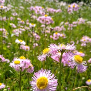 今日のお花🔸ハルジオン🔸 隣りの休耕地に、一面に咲いています🤗🎶 さすが園芸植物由来の帰化植物ですね、とても綺麗です✨🩷💞✨ ② 青みがかったピンクのポンポンの様なキツネアザミも、惹かれる花です💓