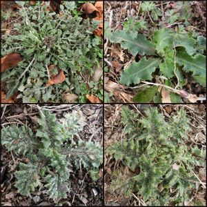 今日の雨でぐんと勢いを増す草木達。 手強い草を退場させる草取りは小さい内が楽なので早目に見極めて抜いてしまいたいです。 下段の2つは多分最強のアメリカオニアザミ💦 去年放置観察したところ2㍍近くまで育ち沢山の花を付けましたが、木綿針のような無数のトゲが狂暴で撤去も一苦労しました。 上段左はナガミヒナゲシのロゼットかと思いきや花目のようなものが中央に出現したので抜かずに調べてみるとキツネアザミのロゼットのようです。 抜かなくて良かった😅可愛いので好きなのです。 もっと小さなロゼットはいくつか抜いてしまいました💦 上段右上が巨大化しそうでトゲも生えそうな怪しいロゼットですが教えて戴いて早目に対処できれば助かりますm(_ _)m *トゲが痛くなければノゲシかもと教えて戴きました🎵引き抜かず観察続行します*