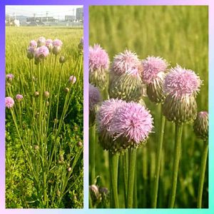 河川敷から麦畑へ散歩 キツネアザミ🦊 緑の麦畑の中でスッとしたピンクの立ち姿が素敵なお花🌼です