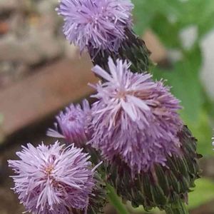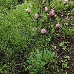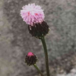 畑の畦道にて 筒状花なのでこれで開花状態 それでもポヨンとしててかわいい アザミの名前を持つけれどアザミではなくてキツネアザミ属 根元の方の葉も撮ればよかった 羽状裂してるはずなんだけどこれではわからないですね 周りに小さな小さなオトメフウロが咲いてるのが見えます