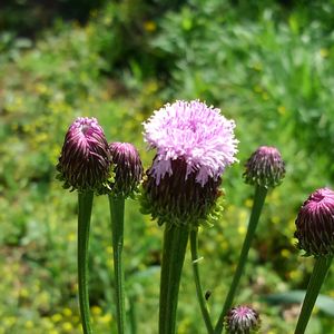 キツネアザミ(狐薊) 化ける トゲのない優しいアザミはしっぽがありそう➿🦊 青空の下、たくさん並んで咲いていました♪ ピンクのフサフサ帽が可愛い💓