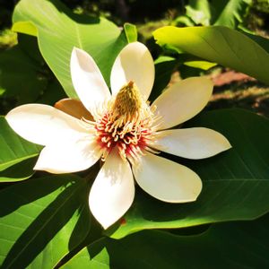 新宿御苑の散策 🤍朴のキ(ホオノキ)🤍 モクレン科 落葉高木 2週間前はまだ硬い蕾だったのに、大きなホウノキの花が咲いてます 寿命は3日ほどで短いです 枝先に強い香りの白い花を上向きに付けます、葉は(大葉味噌)に使われます 花は両生花で、雌性先熟で自家受粉を避け、他の花と受粉するため 中央の赤い雌しべの周りにとりまく紅白の部分が雄しべです ①雌性期‥中央の赤い雌しべの柱頭が反り返って受粉を受ける状態になってます ②③雄性期‥雌しべの柱頭は閉じて下部の雄しべの葯が開いて花粉を出しています