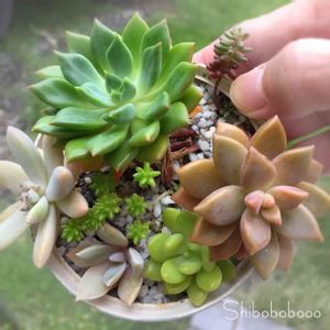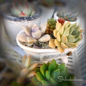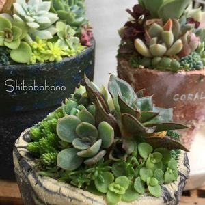 buchi鉢さんにちまちま寄せ おちょこみたいに小さいのに、土もりもりに入れちゃったから、ポロポロこぼれてきて難しかった〜〜 こんな時は、もう少し平らにした方がよかったかな? ちまちま寄せ初心者です💦