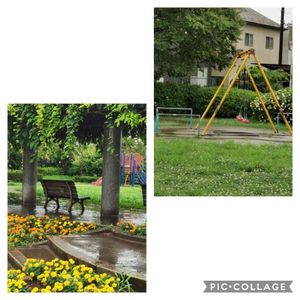 近所の公園🌳 ブランコの手前がシロツメクサ、後ろがクチナシの花🌸 階段には、マリーゴールド💗🎵 誰もいないから、ひとり占め!🥰