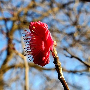 近所の公園 一輪の紅梅が咲きました。 緋梅系の緋梅性の特徴 ー花色が濃い紅色~緋色をしている。 ー新梢は日焼けすると黒褐色になる。 ー多くは樹勢が弱い。 ーーーーーーーーーーーーーーーーーーー 🗒️ 🌸花梅(はなうめ) 花の観賞を目的とする 🌸実梅(みうめ) 実の採取を目的とする 🌸花梅は「3系9性」に分類される。 野梅系(やばいけい) 緋梅系(ひばいけい) 豊後系(ぶんごけい)