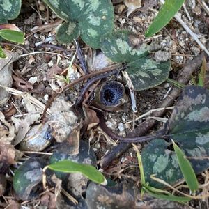 ヒメカンアオイ 雲紋の葉の集まりに出会う💚 紋のない葉も周りにはいくつもあって、これは‼️ ギフチョウの卵でも産み付けられていないかしらん? 根元を見てみると、コロンとした花が現れた(,,>᎑<,,) 4月に投稿したミヤコアオイとは違って萼筒上部にくびれはない🟣 3つに開いたのは萼裂片、萼筒の入口は隆起していて、雄しべに囲まれた雌しべが見える🟪 落ち葉の中に埋もれているのでガサゴソめくると、葉の下に出会えるかも♬