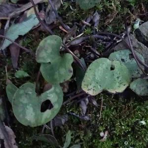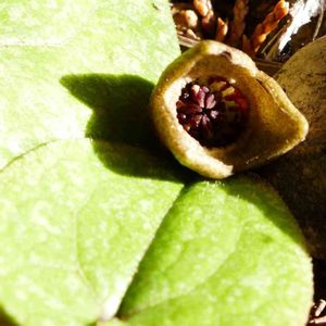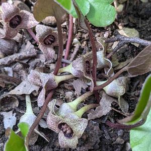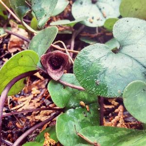 姫寒葵 ウマノスズクサ科カンアオイ属 よく目を凝らして見ると花が沢山付いている ギフチョウやヒメギフチョウの食草として有名です。
