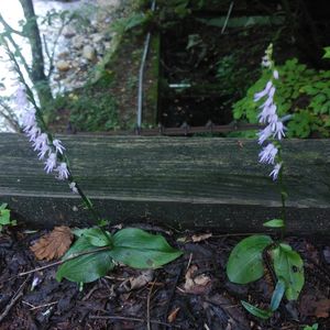 ミヤマモジズリ 希少な植物ですが、この地域には沢山生えてました。 廃トンネルを潜ったその先に、一部足場板の腐った吊り橋があり、恐る恐る渡っていると、なんと足場板の上にミヤマモジズリが根を張っているのです。 その後もあちこちでミヤマモジズリが見られ、とても嬉しい気分でこの地をあとにしたのですが、数㎞下った土産屋で鉢植えにされたミヤマモジズリが販売されていました。炎天下の中、直射光に晒され葉が溶けている姿を見てとても残念な気持ちになりました。 盗掘されたのでしょうね。
