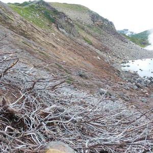 白骨化したハイマツ 室堂平の地獄谷 火山ガスが轟音とともに吹き出しています。噴気帯に生えていたため、枯れた枝が真っ白になってました。 盆栽の神(ジン)と舎利(シャリ)をつくる為に石灰硫黄合剤を塗るのと同じ効果なんでしょうね。