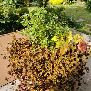 ミニバラほほえみルージュと、リキマシアミッドナイトサンのお花が終わったので、分解! 2枚目はほほえみルージュを単独で鉢に移し替えたもの。 また暫く日に当てて咲くのを待ちます。 ミッドナイトサン地植えしました。 ヒューケラは弱々しかったので他の寄せ植えに植込みました。 どこに植え替えるか考えるのが楽しい♥