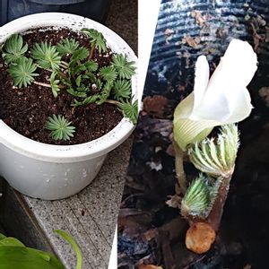 嬉しい出来事 その② 孔雀の舞ちゃんに、お花が 咲きました。💕💕 左は、ゆーちゃんさんから、頂いた 1月の状態で、葉っぱが、枯れて 球根 掘りあげて、10月に、植え付けました。 遅くから 植えたので、芽が出るか心配していましたら、 あれよあれよと、言う間に、 右のような お花ちゃんが。💕💕💕💕 滅多に 咲かないらしいですよ!😍😍😍