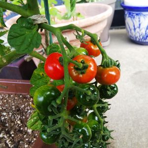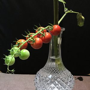 プチプヨ・ミニトマト 先日の台風の影響で、実の付いたミニトマトの枝がポッキリ折れていました。 ほとんど青い実が付いていたので、花瓶に入れてしばらく飾ったところ、赤くなってきました。 プチプヨは、実が割れにくいので、このまま完熟まで楽しみます。 テーブルのミニトマトは、強風や鳥や虫による落下や食害の心配ないので、ゆっくり赤くなり意気揚々です。 🍅(๑˃̵ᴗ˂̵)ガンバレー