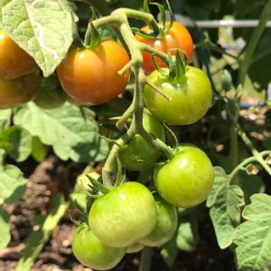 野菜部👩🌾 初めて育てている、プチプヨが色づきました🍅 艶といい、皮の柔らかさといいこんなトマトがあるのねー🥰 まだ、未完熟だけど今年初めての🍅の試食しました😋🎶