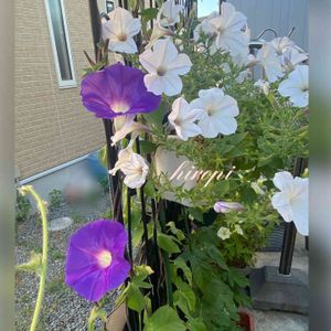 おはようございます。 朝のお庭です。 朝顔とサファニア 寝室の窓からから見えるように 種から朝顔を植えました。 何色なのか柄ありか わからないので 開花が楽しみでした。
