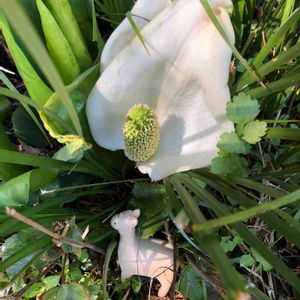 うちの裏庭にこの時期になると顔を見せる 大きなお化け水芭蕉 下の羊さんは、4センチぐらい 羊さんびっくりしてますね🐑 葉っぱが出てきて成長するとかなり大きくなります 裏山に入る入り口の小川が流れているところに2つ咲きます この辺りは手入れが行き届かず、雑草がボーボーです😅