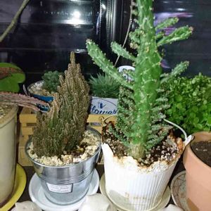 多肉植物寄せ植えしました。 サボテンみたいな形のユーフォルビア オンコクラータ🌵で高さを出して 足元にはセレウス . キンエボシに銀手毬、姫キリンを寄せました🌵 . この鉢、サボテン🌵さんは100均なんですよ😊ちょっといい感じ💕自己満足です