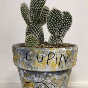 タニ友ちゃんの息子 兄画伯のリメ鉢‼️ うちのワンコの ルパンを描いてくれてます 黄色ぽい バニーを植えました‼️ あた2つあるサボテン🌵を 私の友達が 狙ってます‼️ あげないけどね💦