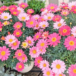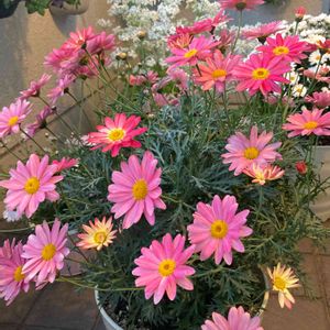 今日のベランダ❁⃘*.゚ ラックス ミネルバさん、マーガレットシンプリーコーラルさん、タグ無し(多分ソレミオ)マーガレットさん💛💛💛 次々開花🩷🩷🩷