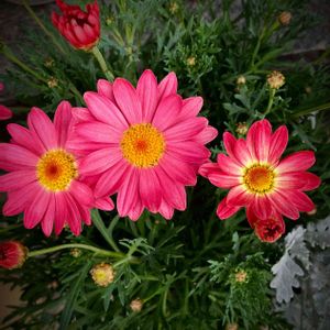 PWマーガレット シンプリーコーラル❁⃘*.゚ まだお花よりつぼみの方が多いけど 花数が増えてきました𖤣𖥧𖥣𖡡𖥧𖤣 見切りちゃんですが 色鮮やかに元気に咲いてくれています🤗 今日は雨が降りなんとなく暗いけど この子がいると なんだか明るい感じがします❁¨̮