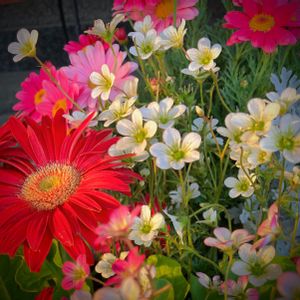 ガーベラのパートナーが替わりました❁⃘*.゚ 冬の間一緒にいてくれたネモフィラは のびのび過ごせる広い庭に引越しました❁¨̮ 替わりに入ってくれたのは こちらの雲間草❀.*・゚ ピンクは下の方にちょこっと写ってるだけになってますが白とピンクの両方を寄せました😊 後ろのピンクのマーガレットは 先日upのシンプリーコーラル❁ おとなりからこんにちはです🤭