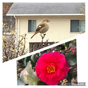 ジョウビタキ メス 撮れました‼️ まーるいお腹が可愛い😍💕 メスは地味だけど 白い紋は意外と目立ってました♬ エサは赤い実や虫みたいです🦟 庭のサザンカが満開🌸 うちのサザンカは 色んな方向向いて咲いていて, 結局おひとり様になりました😅