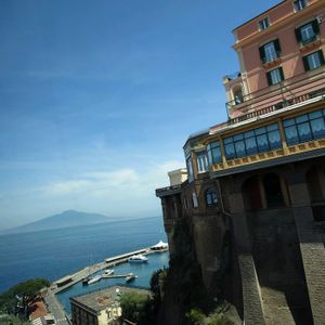 4月21日(月) イタリア🇮🇹旅行 ソレント カプリ島よりフェリー⛴️でソレントへ向かう。 ソレントは断崖絶壁の上に ぎっしりホテルやレストランが立ち並ぶ リゾートのある半島 思わず『帰れソレントへ』を口ずさむ 遠くナポリ ベスピオ火山を望む 3枚目は市民広場 ブラシの木のもとで憩う人たち やっぱりここもレモン🍋の島