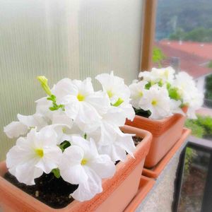 種から育ったペチュニア 残りもすべて咲きましたが、白ばかり😂 こちらはテラコッタの鉢で。 なかなかの大輪です🙆