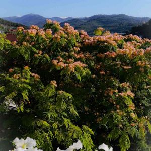 今年もお隣さんのねむの木の花がたくさん咲いています。 6月後半は日が長くて、一年のうちで一番好きです。 うちの白ペチュニアもちょこっと出演😅