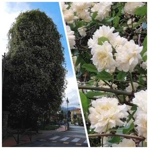 大木🌳に花が咲いている👀✨ これはなんの木❓🤔...と思い、 近くに確かめに行ったら、 白い⚪モッコウバラが巻きついていました🌹✨ ほぼ頂上まで。スゴーイ😲😲😲