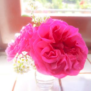強い雨に降られ、ショボン🥀としてしまったバラの花をチョキン✂️して、アリッサムと一緒にしばしキッチンの窓辺へ☺️