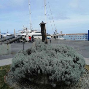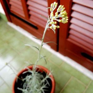 ふたつ前に投稿したカレープラントの親🍛 モリモリ育って石臼が隠れてしまいました😆 (2/4の投稿で石臼が見れます) 今回は港を背景に🛥️別のアングルで🤳 なぜか、お花が咲いているのは海側だけ😲 好き嫌いがハッキリしてるのね🤭 あ、誰かさん、なにか落としましたよ👀