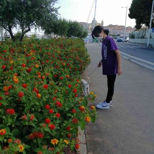 今日のお散歩 with 👧🐩 ブーゲンビリアのアーチの下はピンクの落ち葉がいっぱい💗
