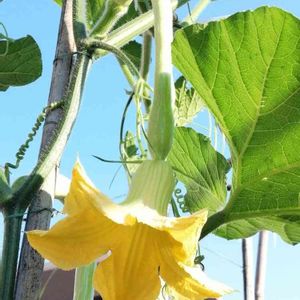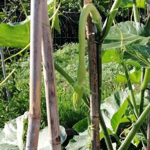 トロンベッタ(小さなトランペット🎺)という名のズッキーニです。 イタリアの私が住む地方では、このズッキーニの栽培が盛んです。蔓があり、空に向かってグングン成長します⬆️ 雌花が開花したら、収穫です💕