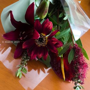 花束をもらいました✿.•¨• 娘が車を買ってもらった花束。 全部シックな紅い花。 (ღ*ˇ ˇ*)。o♡ᔆᵘᵗᵉᵏⁱ♡