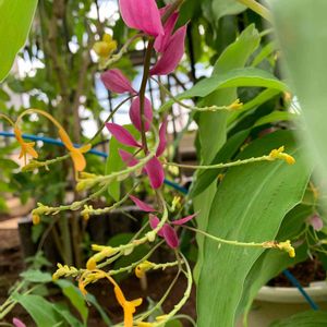 グロッバウィニティ 別名『シャムの舞姫』優雅に踊っていましたよ🎶ピンクは苞で先に付いてるの黄色部分が花です。雄しべが弓なりに上に伸び、先端に星⭐️がついているような姿が、優美でした。