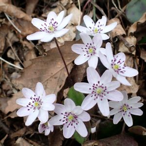 ①スポットの入った雪割草(ミスミソウ) ②その後ろでフクジュソウも芽吹きました ③雪割草(ミスミソウ)