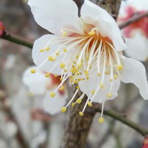 梅 白加賀 白い花びら 赤い萼 記憶の中の梅の花。 ふくよかな、香りが漂っているよ。 果肉が厚く、繊維が少ない。梅干し、梅酒、梅ジュースに。 シべがフサフサと、長いね!