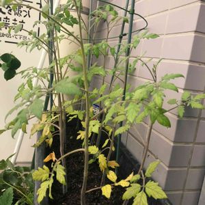 # 中玉トマト🍅 (フルティカ)ベランダ菜園 おはようございます☀💦 たまには野菜もアップ😅 🍅トマトの枝を曲げる と下の実に栄養が行き 大きく沢山なるって‥ 真似っこ✨🎶 ただ今すくすく 成長中🍅🍃
