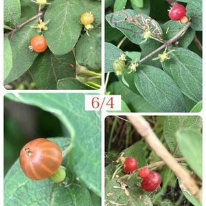 キンギンボク(金銀木)スイカズラ科スイカズラ属 落葉低木 ③スイカズラとそっくりな花をさかせます スイカズラは金銀花 ①花からずっと赤くなるのを待っていました 雨が多かったせいか随分と時間がかかりました ②果実はピッタリと付いてなるので完全癒着か?離れましたよ ③お花です