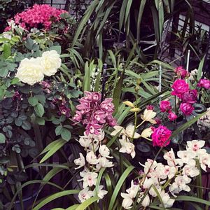 色々なシンビジューム♦️ 白薔薇や他にも薔薇が沢山🌹 皐月の鉢植え🌸 車庫いっぱい咲いています🌸🌼 お向かいの車庫