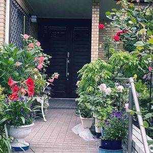 薔薇🌹や他にも沢山の鉢植えの花が花盛り 🌸🌼 お手入れが良いんですね〜 いつもお花で溢れています😊 お向かいの玄関先🌸🌼